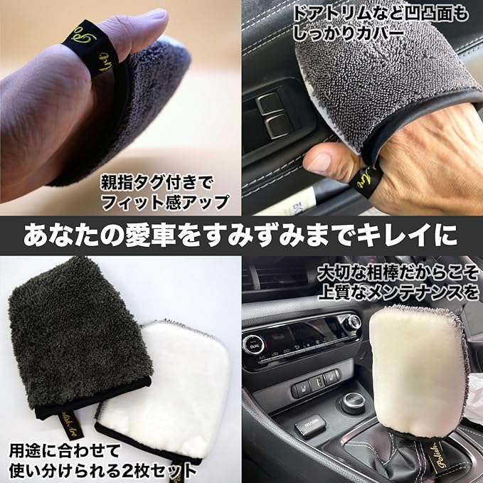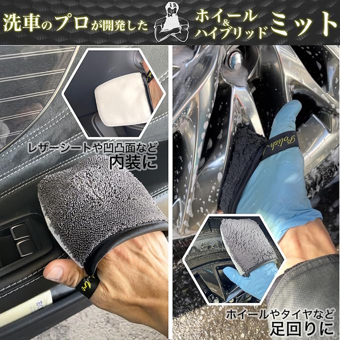 【オールインワンな2枚セット】ホイールミットとハイブリッドミット(レザーシートブラシ)の2枚セット。用途によって使い分けることでプロ級の洗車を実現できます。