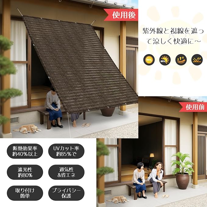 【遮光性と遮熱効果が良い】UVカット率約85%で、遮光性約80%です、真夏の暑い日差しを遮、で肌の日焼けや家具や床の劣化も防ぐ事ができます。可能で、遮光以外に気になる視線をカットする。程よくプライバシーも守られる。強い日差しを遮る、シェード下の地表温度も下げ、風も通しますので夏でも外で快適に過ごすことができます。室内の温度を下げることができ、エアコンの使用も抑え、電気代(冷房)節約に有用。