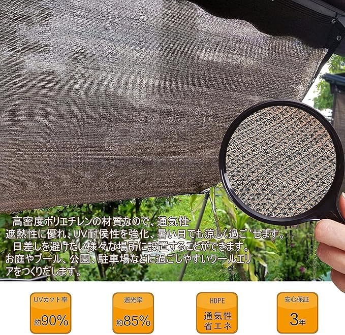 <br>【UV紫外線カット】 紫外線に強く色褪せにくい優れた耐候性。直射日光を遮り、紫外線を約95%カットしてくれます、遮光率は約85%。シェード下の地表温度も下げ、風も通しますので夏でも外で快適に過ごすことができます。窓際に取り付けることで、日差しなどの太陽熱の影響を和らげ、室温上昇を抑制します。エアコンの使用も抑えられますので、節電に最適です。