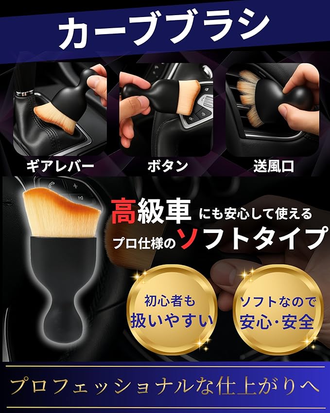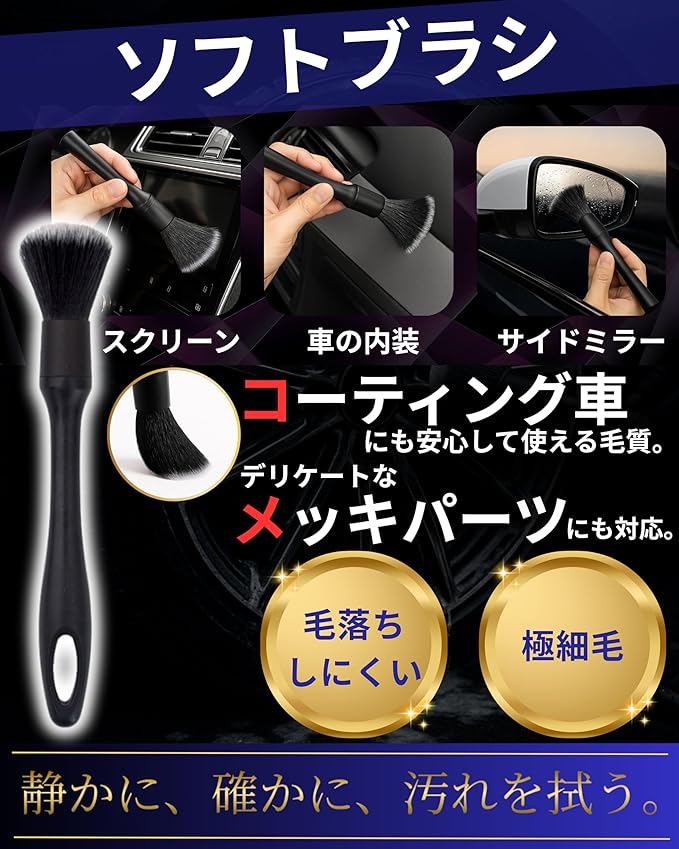ソフトブラシ:メッキや内装など、傷つきやすいパーツの掃除に。