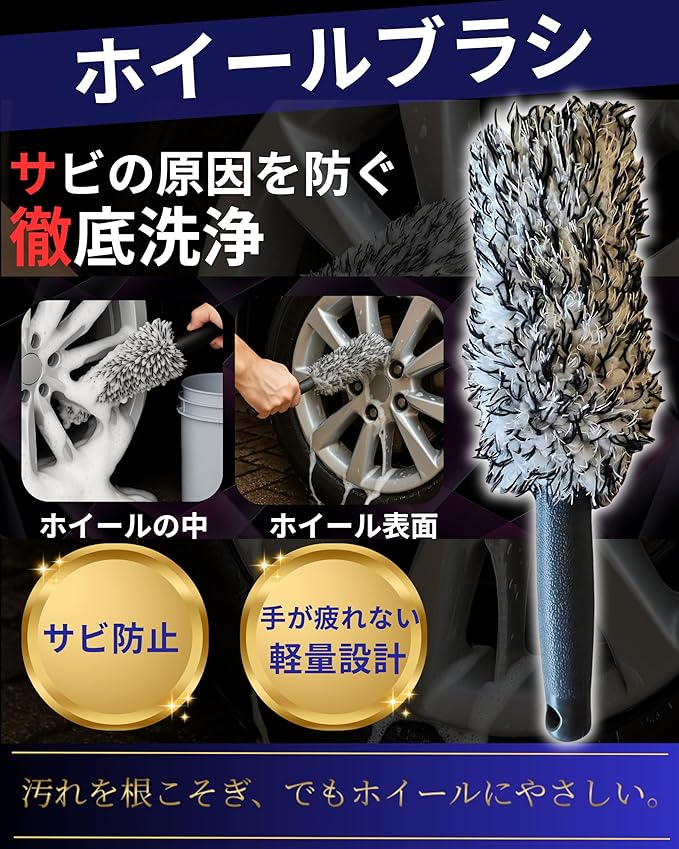 ホイールブラシ:デリケートなホイールを傷つけず、ブレーキダストもスッキリ除去。