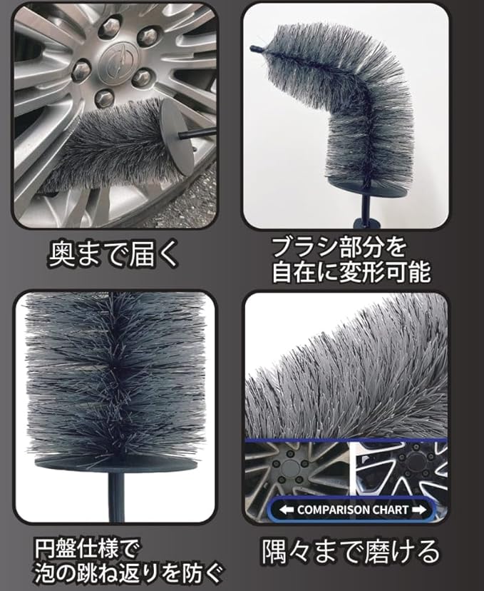 根こそぎ落とす、ホイールブラシ。 ホイール奥からタイヤハウスまでスムーズに綺麗にできます。