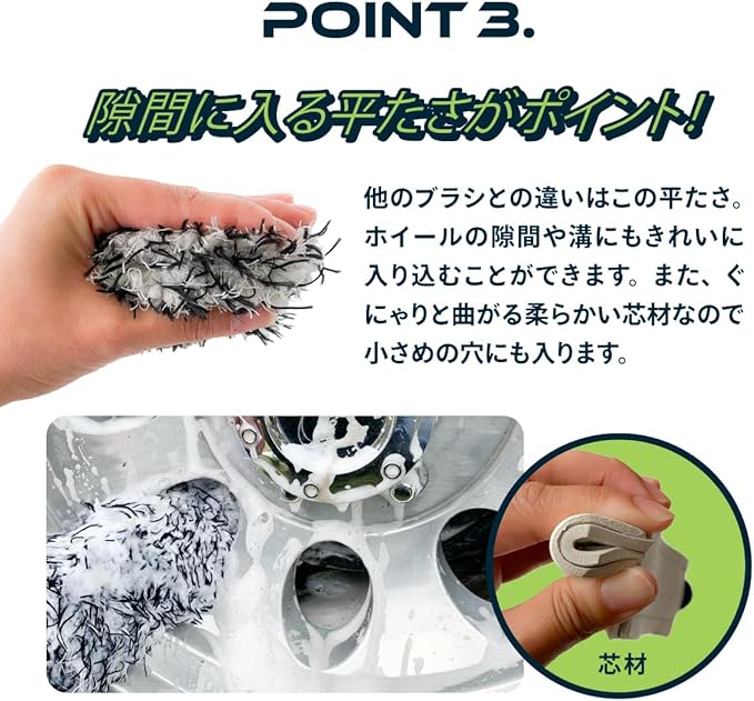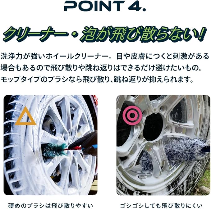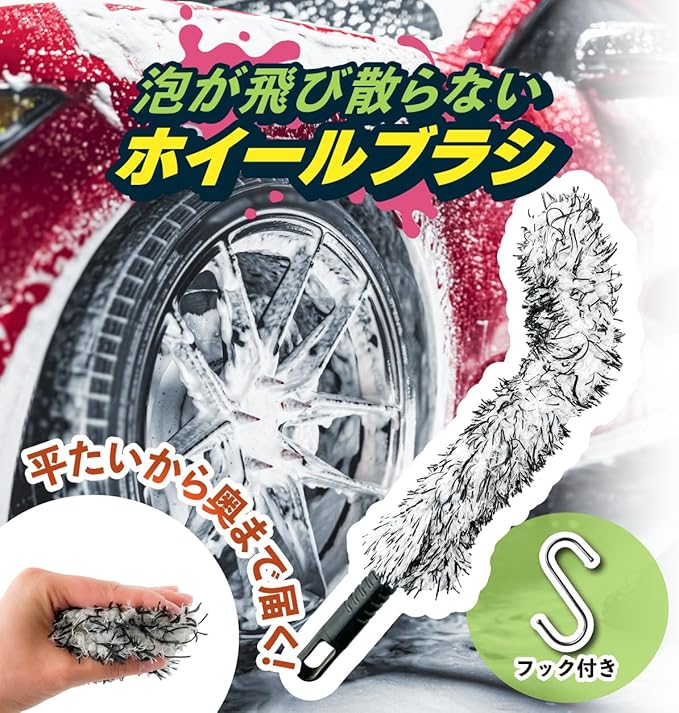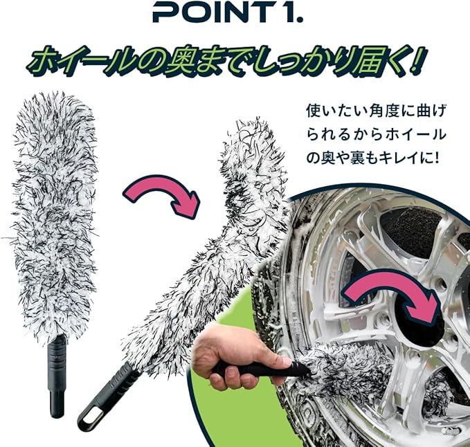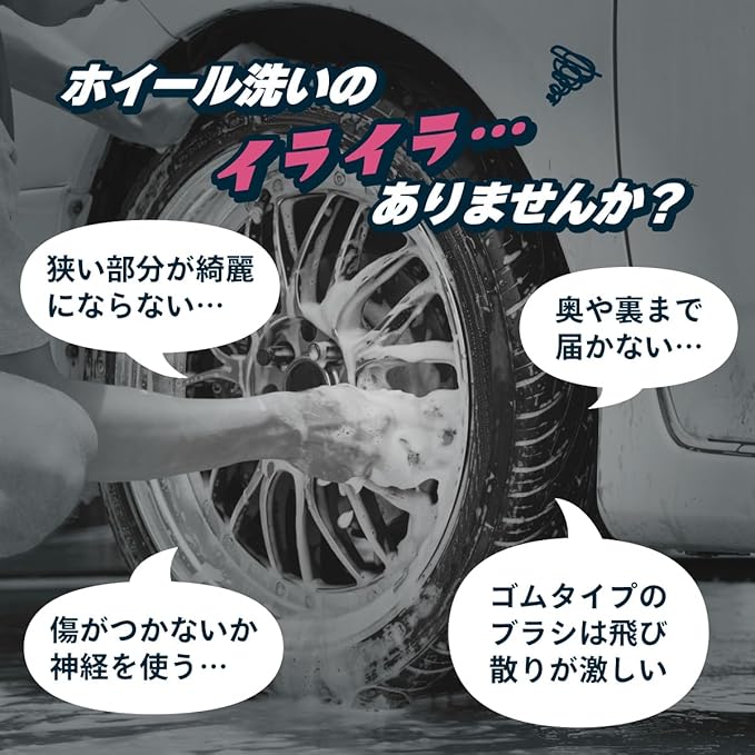 今までの 洗車スポンジ や ホイールブラシ では届きづらかった【ホイールの裏側】、キャリパーが邪魔でブラシが入らない・・・特にリム幅の太い外車等はブレーキダストも多いから頻繁に洗わないとなどのお悩みを解決!