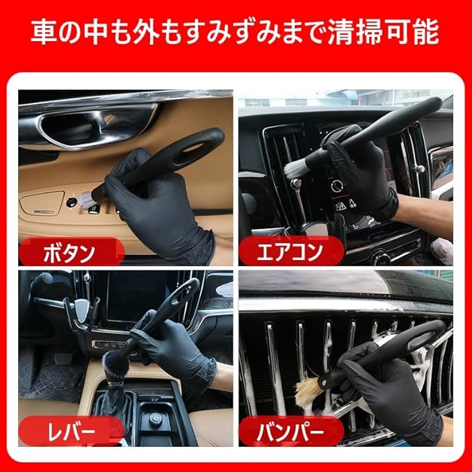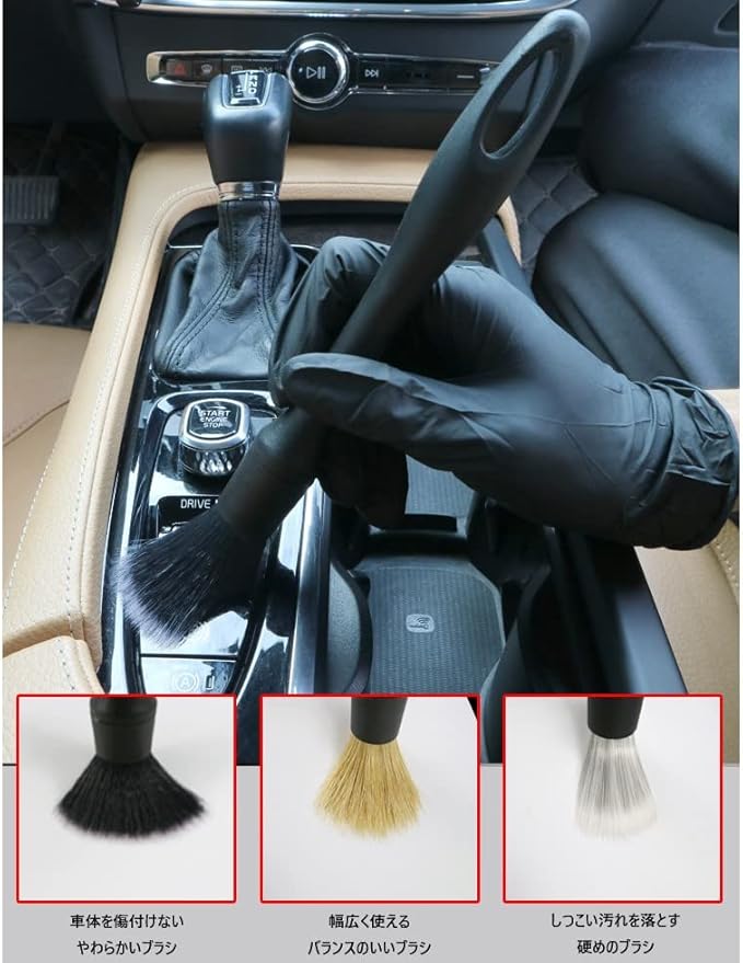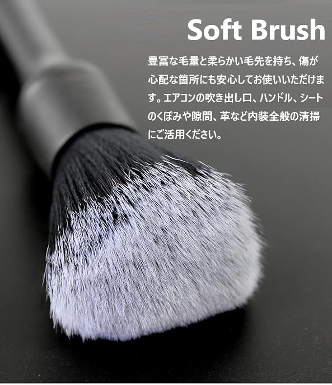【ソフト:化粧筆のようなやわらかさ】豊富な毛量と柔らかい毛先を持つソフトブラシは傷が心配な箇所にも安心してお使いいただけます。エアコンの吹き出し口、ハンドル、シートのくぼみや隙間、革など内装全般の清掃にご活用ください。