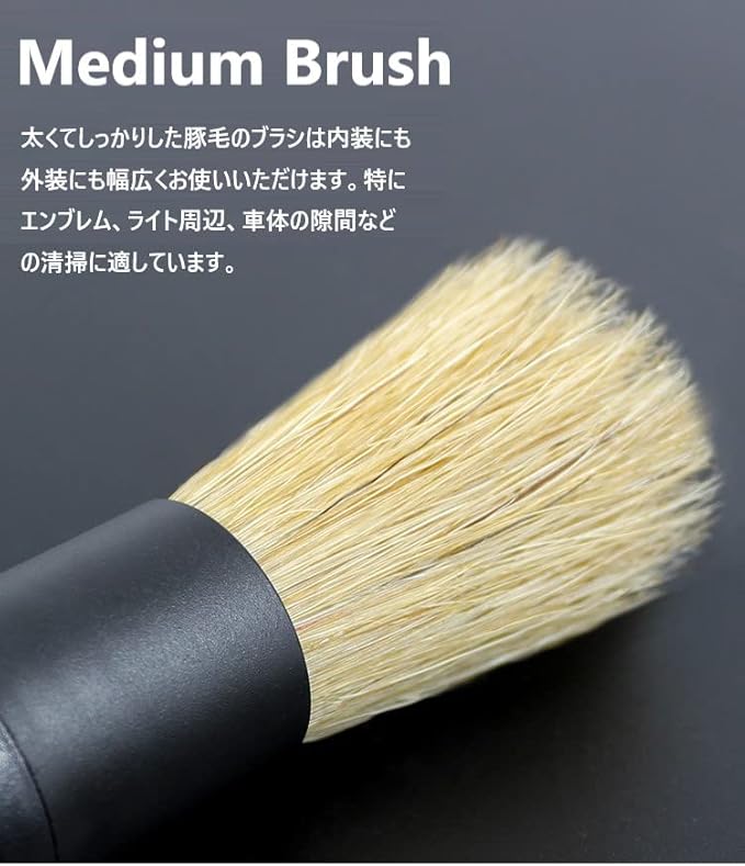 【ミディアム:豚毛を使ったバランスの良い硬さ】太くてしっかりした毛のミディアムブラシは内装にも外装にも幅広くお使いいただけます。特にエンブレム、ライト周辺、車体の隙間などの清掃に適しています。