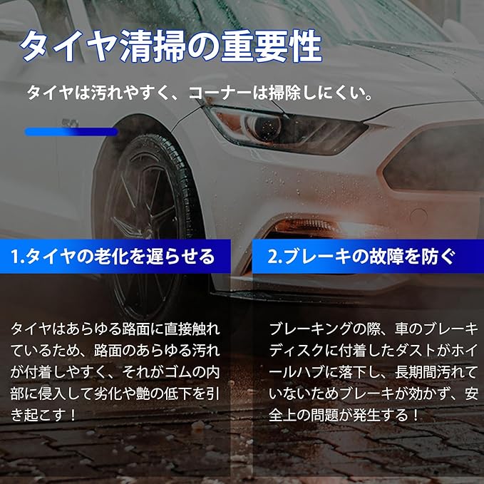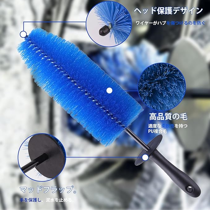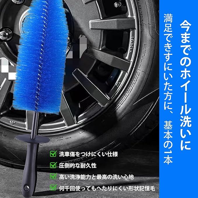 【ホイールブラシ】このタイヤブラシは、ホイールの隙間や手の届きにくい部分の洗浄に最適。特殊形状の毛材で、ホイール表面に傷をつけずに汚れをしっかり除去できます。ホイール洗車に欠かせない洗車ホイールブラシ。