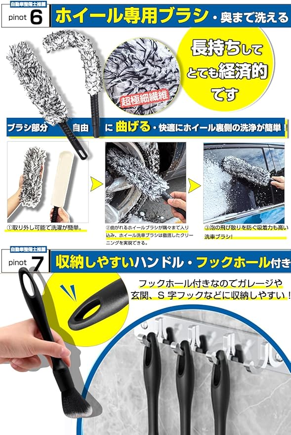 【自動車整備士推薦 6種類 6本セットの洗車ブラシ】:✅【ソフトブラシ】: 柔らかいブラシを使用すると、傷を効果的に防ぐことができます。✅【ミディアムブラシ】: 豚毛ブラシ。主に車のロゴ、車のグリル、ヘッドライトの隙間、車体の隙間などのやや硬い部分の清掃に使用されます。✅【ハードブラシ】: ハードの洗車ブラシで狭い隙間や強固な汚れに最適なブラシ。✅【マイクロブラシ】:車のエンブレム、レター、ヘッドライトの隙間、車体の隙間など汚れをピンポイントで除去できます。✅【ソフトブラシ車内用】主にエアコンの出口、ハンドルの隙間、シートの隙間、革の表面などに使用できます。✅【ホイール専用ブラシ】平たい芯にモフモフした埃取りが被せてあります。平たく曲がる埃取りは、洗濯機の下の掃除に便利です。ホイールブラシだけど、洗面所に使うと便利でした。