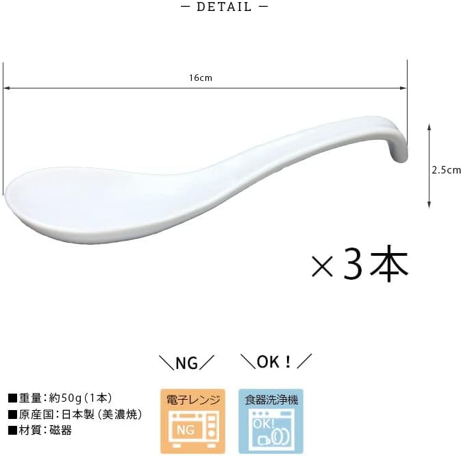 【ストッパーが便利なレンゲ】ツルっと艶感のある磁器製のレンゲ3本組。どんぶりの中にすべり落ちないストッパー(ひっかけ)付。
