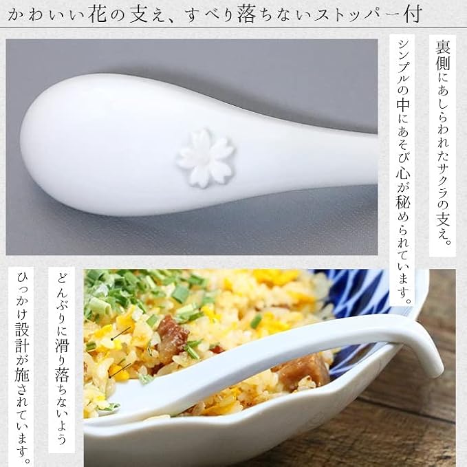 【お料理を選ばないシンプルデザイン】無地ホワイトのシンプルでスリムな形状のレンゲは、麺類やお鍋のレンゲとしてはもちろん、チャーハンなどのスプーンとしても使いやすい。裏面の立体的なお花がワンポイント♪