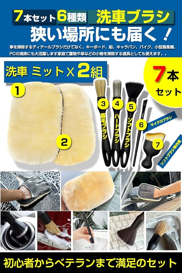 Fieekty【2025新登場 】洗車ブラシ 洗車 ムートングローブ 6種類 7本セット 洗車 ミット 洗車 グローブ ディテールブラシ ホイール ボディ用 車内掃除用 隙間掃除 傷つかない 洗車セット 洗車 筆ブラシ 洗車 刷毛 洗車グッズ カー用品 手袋 傷防止 洗車用品セット 便利 柔らかい 豚毛 換気口 乾湿両用 筆タイプ