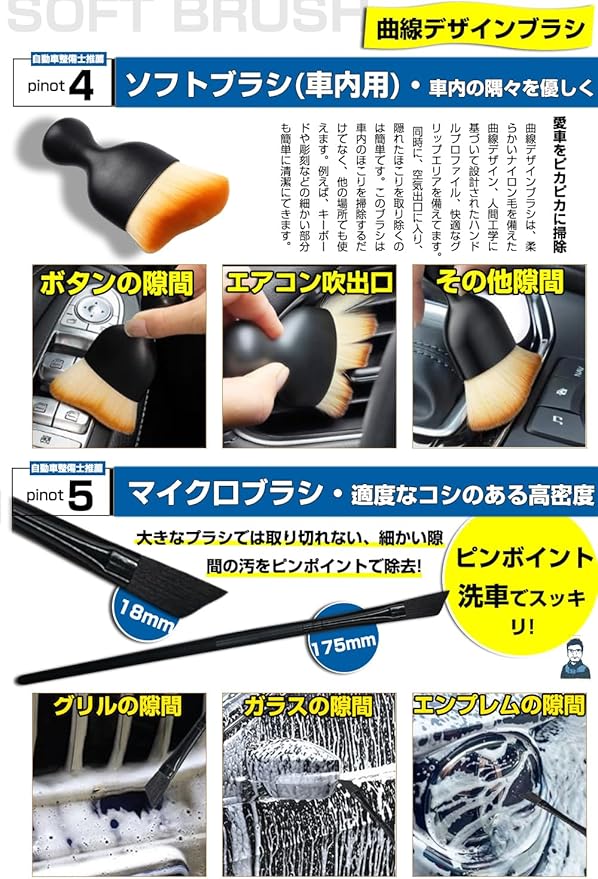 【幅広い用途】車を掃除するディテールブラシだけでなく、キーボード、船、キャラバン、バイク、小型扇風機、家庭で置物や革などの小物を掃除する道具としても使えます。PC(マザボ、ファン、キーボード・CPUクーラーなど)の清掃にも大活躍します。