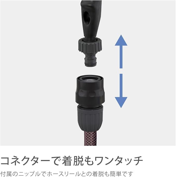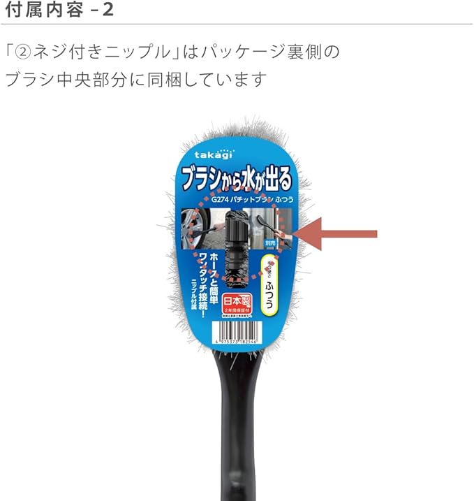 ホースの先端に散水コネクターがついたホース・ホースリールに繋げば、水を出しながら洗車ができるブラシです。