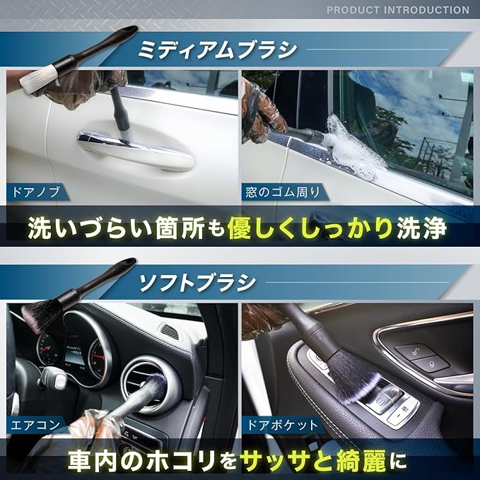 [4種類のディテールブラシセット]4種のブラシで、スポンジでは落としきれないホイールやエンブレムなどの細かいを徹底的に落とす大満足の洗車セットです。車内清掃にも対応できるソフトブラシ付きです。