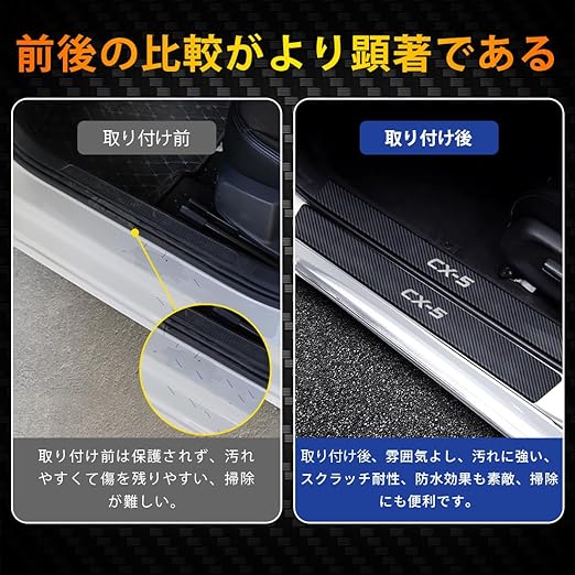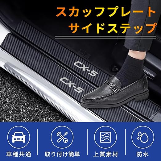 【適合車種】弊社のサイドステップガードはマツダCX-5全シリーズに適合します.弊社の製品は全て最新の接着技術で研究されて、粘着力は非常に強くてはげることはありません.印字はも褪せる、はげ落ちるなどが決してありません.弊社の製品は他のマツダタイプも違和感なし適用します.