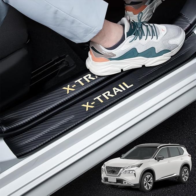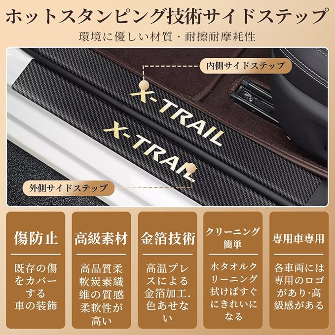 新型エクストレイル X‐TRAIL (令和5)年発売モデル (令和6)年発売モデル (令和6)年12月 発売モデル (令和4)年7月 発売モデル 全シリーズ適用 サイドステップガード スカッフプレート エクストレイル全シリーズ適用 エクストレイル内装パーツ 金箔技術 金メッキ技術 内装アクセサリー 粘着力強い 水防止 汚れ防止 傷防止 簡単取り付け 4件セット (金色)