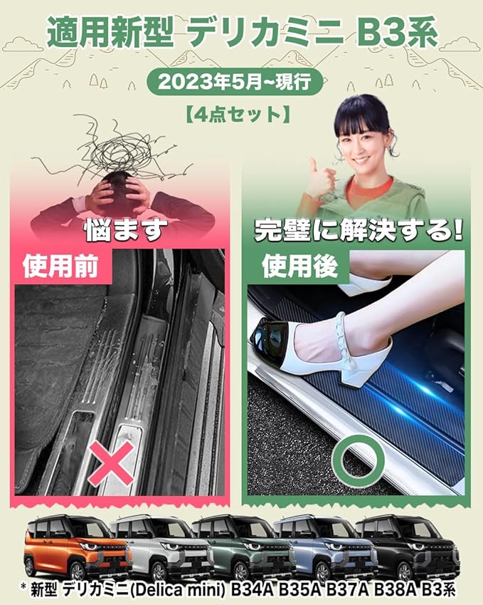 HUDIY(フーディ)新型デリカミニ(Delica mini) B34A B35A B37A B38A B3系 車 サイドステップガード スカッフプレート サイドステップ(2023年5月~) 滑り止め 汚れ防止 キズ防止 日本語の取り付け説明書付き 4点セット(V4)