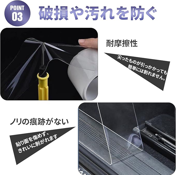 【製品のメリット】 ナノ素材採用の自動車用プロテクションフィルム。強力な粘着力で車体にしっかり密着しながら、剥がした際に糊跡や残留物を残さない。卓越した耐摩耗性を備え、鋭利なもので突き刺されても損傷しません。