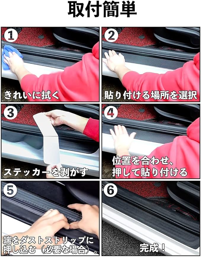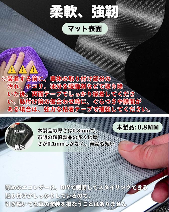 【高品質素材-カーボンファイバー】ドアシル装飾ストリップはカーボンファイバービニール製で、強力な接着剤を使用しています。ちぎっても車体に粘着性の残留物がなく、塗装面が損傷することはありません。