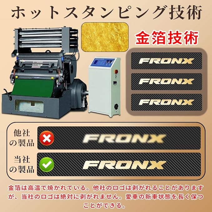 【適合車種】弊社のサイドステップガードはスズキフロンクス2024(令和6)年10月発売モデルに適合します.弊社の製品はフロンクス全系に装着しても違和感なし、ご安心ください.弊社の製品は全て最新の接着技術で研究されて、粘着力は非常に強くてはげることはありません.印字はも褪せる、はげ落ちるなどが決してありません.