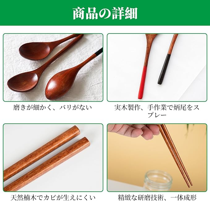 【製品情報】この木製食器セットには、スプーン2足とお箸2足の4点セットが含まれています。この組み合わせは、日常的な食事、置き換え、さまざまな食事のニーズに適しており、キッチンの必須アイテムです。