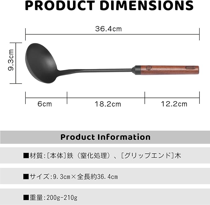 中華鍋専用のお玉 中華 おたま レードル 窒化鉄 錆びにくい 木製取っ手 耐熱 吊り下げ 穴付き 握りやすい 料理 調理スプーン キッチン用品 木目調 シンプル ブラック