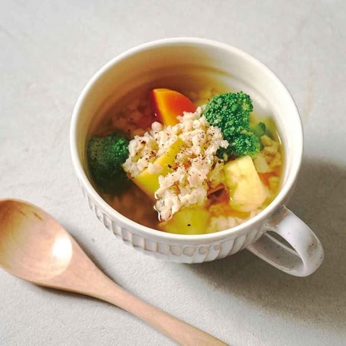 【サイズ】スープカップ:直径11.2 高さ7.2cm、スプーン:16cm 【容量】410ml 【重量】580g 【素材】スープカップ:磁器(美濃焼)、スプーン:天然木・ウレタン塗装 【生産国】スープカップ:日本、スプーン:中国