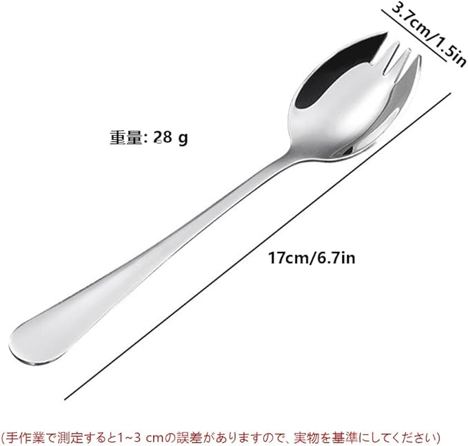 素材: 耐久性が高いの304ステンレス製スプーン。サイズ:全長17cm x幅3.7cm。重量:28g。食器洗浄乾燥機使用可。シルバーで高級感を示します。便利さ。フォークとスプーンの結合体で、日常よく使われている多用途食器セットです。食洗器・乾燥機対応で、洗うのは楽だうえに、食べ物の屑は残りません。プレゼントとしても最適です。クリスマス、正月、母の日、七五三お祝い、新婚お祝い、お誕生日、パーティーなど、各種な場合で大活躍でス。