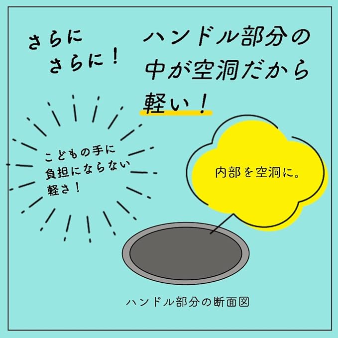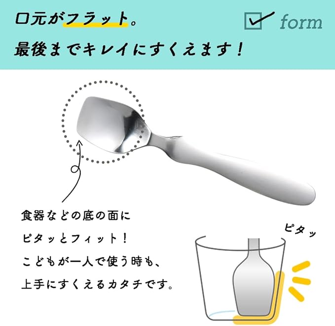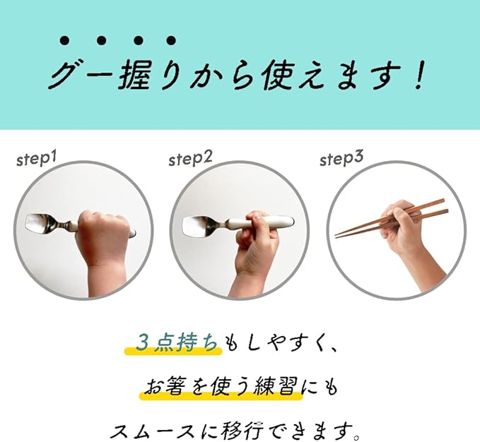 自分でしっかり握れて食べられる持ち手ふっくらタイプのスプーンです。オールステンレスなのでまるごとつるっと洗えて衛生的。食器洗い機対応なので洗い物もラクチンです。三点持ちしやすい設計で、箸への移行もスムーズに!