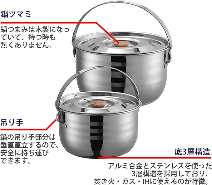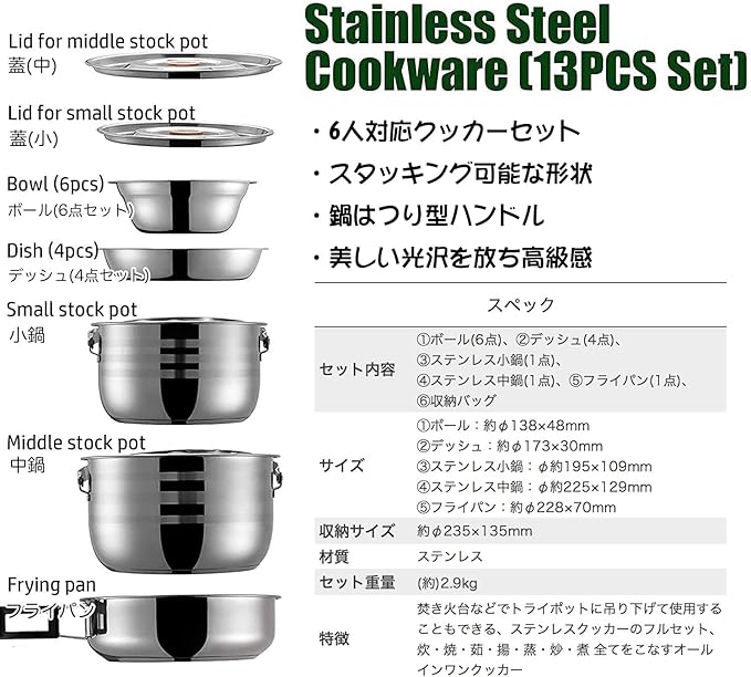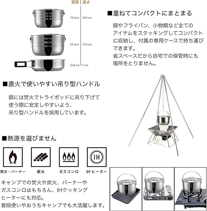 特徴:焚き火台などでトライポットに吊り下げて使用することもできる、ステンレスクッカーのフルセット、炊・焼・茹・揚・蒸・炒・煮 全てをこなすオールインワンクッカー