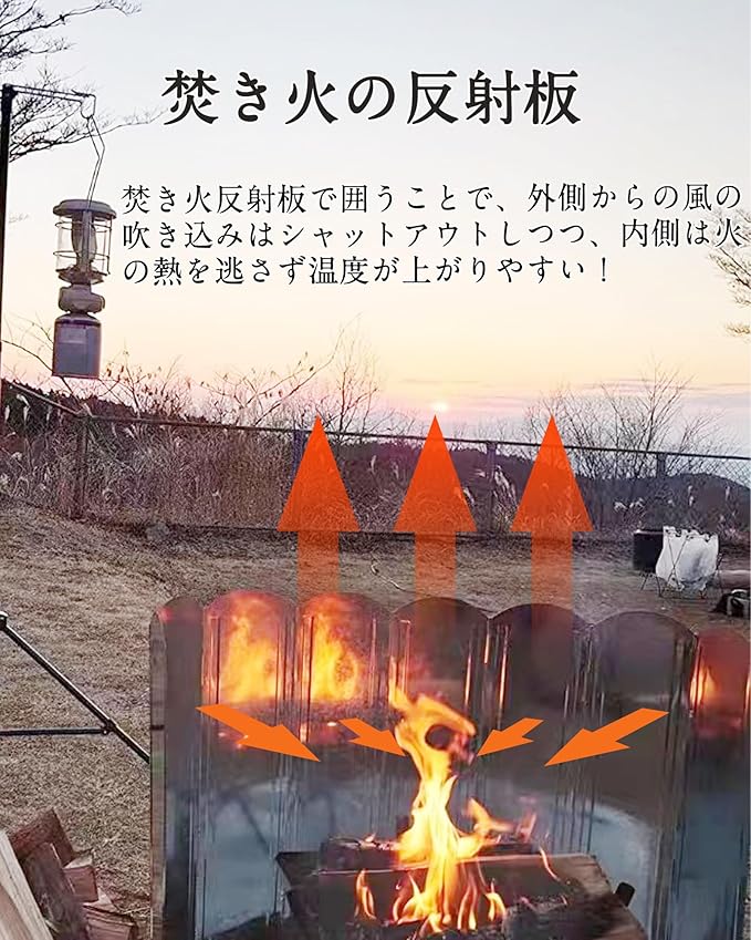 【1台多役】暖房効果を作りたり、風避けて炎を安定に燃焼させたり、燃料を節約したり、火の粉が飛び散る危険も防げます、1台で多くの役割を果たしています。焚き火台に組合わせて、風による燃料の浪費、炎の不安定さを防ぎ、燃焼効率が大幅に向上して調理時間を効率的に短縮します。また油ハネを防止できるし、寒い時期に暖を取るのも非常に役立ちます。
