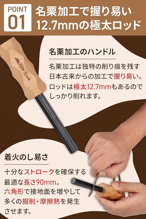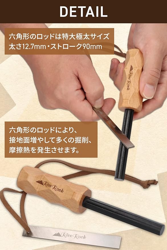 ◆【ロッド】極太ヘキサ型フェロセリウムロッドです。マグネシウムロッドより着火温度が低いフェロセリウムを採用。形状を六角形にすることでロッドとストライカーの接地面を増やし、切削力、摩擦熱を発生させ、大量の火花を散らします。極太12.7mmストローク長さ90mmで2万回以上ストローク可能です。◆持ち手は作業性、デザイン性を兼ね備えて名栗加工グリップです。名栗加工は独特の削り痕を残す日本古来の加工技術です。握りやすくしっかりストロークをサポートします。