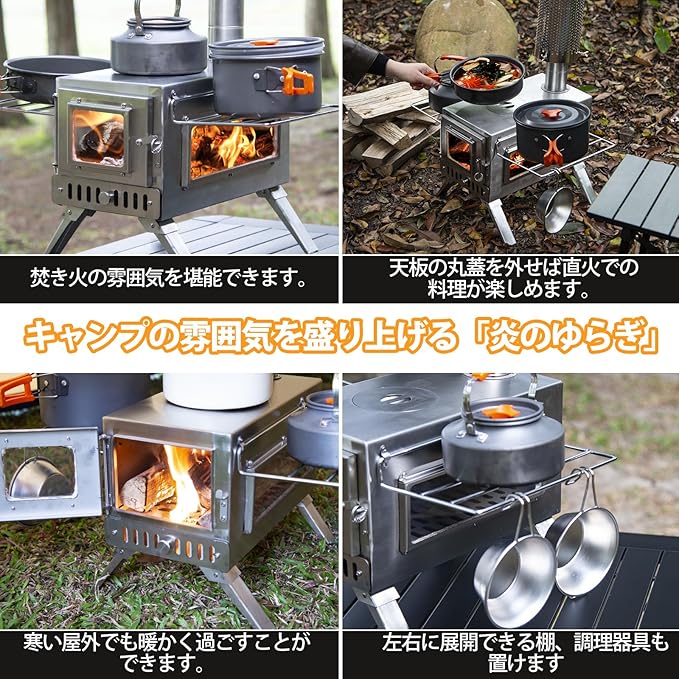 ✅【摇らぐ炎を眺める2面ガラス窓】:キャンプストーブの前面と片側側面に耐熱ガラスの窓を装備しています、側面ガラス窓 (サイズ:90*110mm)、前面ガラス窓 (サイズ:270*100mm)になっており、ストーブの中の薪の残量を確認しやすいだけでなく、窓から覗く「炎のゆらぎ」、夜の雰囲気を最高!✅【長さ35cmの薪に対応】: 35cm程度の薪にまで対応しています。キャンプ薪ストーブは扱いやすく、片付けや手入れもラクラクです。長く愛用できます。