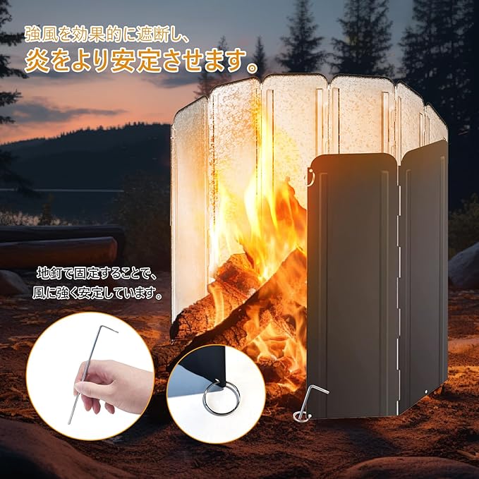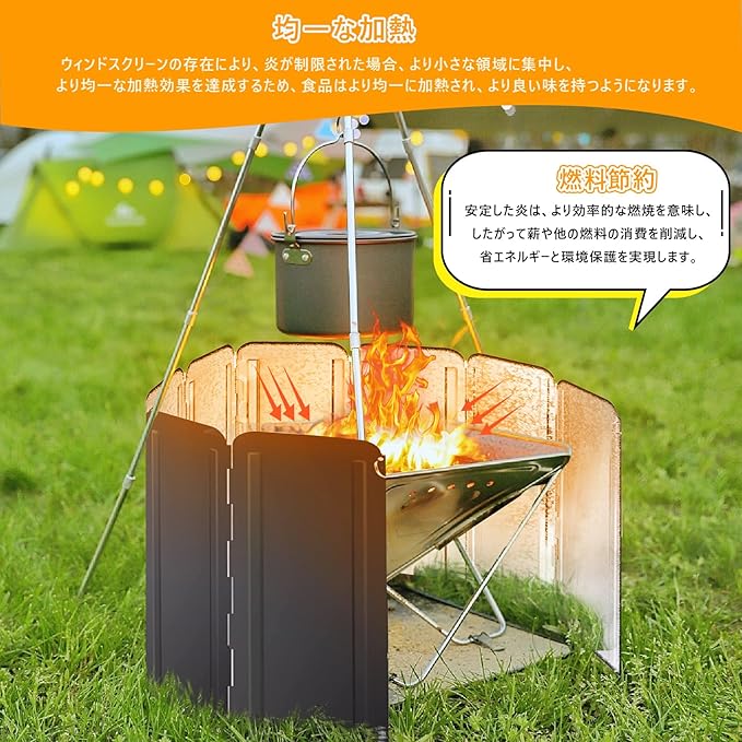 調理効率向上: 8枚パネル式折り畳みウィンドスクリーンは、ストーブを周囲の風から保護するだけでなく、熱利用効率を高め、調理時間を短縮。燃料消費の削減にも貢献します。