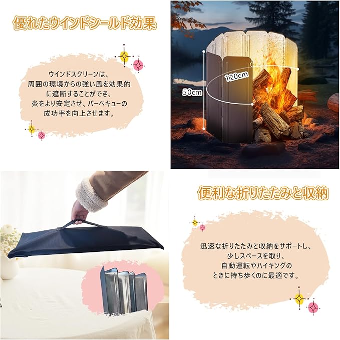 幅広い用途: アウトドアストーブウィンドスクリーンは、ピクニック、バックパッキング、キャンプ、BBQ、釣り、ドライブ旅行、川下り、車中泊、ハイキングなど、多様なアウトドアシーンで活躍します。