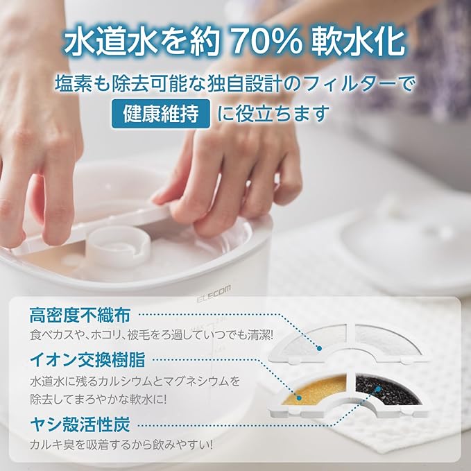 独自設計の高密度3層構造フィルターが流れる水を逃さずキレイをキープ。水道水を約70%軟水化したごくごく飲めるおいしいお水で、ネコちゃん・ワンちゃんの下部尿路の健康維持をサポートします。 ※国内試験機関にて分析評価済み