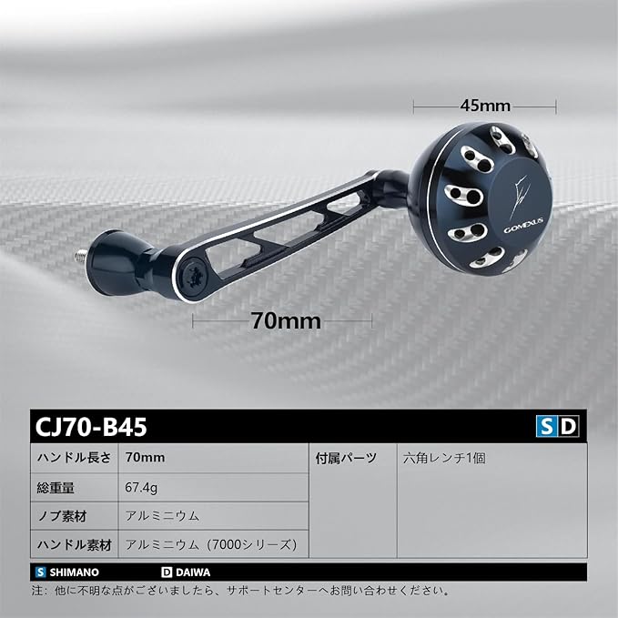 【製品仕様】ハンドル素材:7000系超々ジュラルミン、ハンドル長さ:70mm、ハンドル重さ:49.3g、ハンドルノブ素材:アルミ製、ノブ長さ:45mm、付属品:六角レンチ