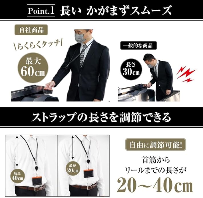 パスケース 【60cm伸縮リール】「30㎝じゃ短い!」というお客様の声から余裕の60cm伸縮リールで無理なくタッチ。首にかけたままセキュリティゲートも、しゃがまずに楽々タッチ。