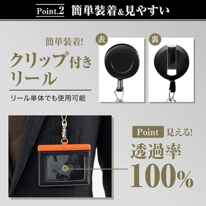 カードホルダー【ストラップは長さ調節可能】長さ調節が自由に(高身長の方でも低身長の方でも対応)。リール裏のクリップで装着も簡単。ストラップとリールは分離可能。胸ポケットに簡単装着。
