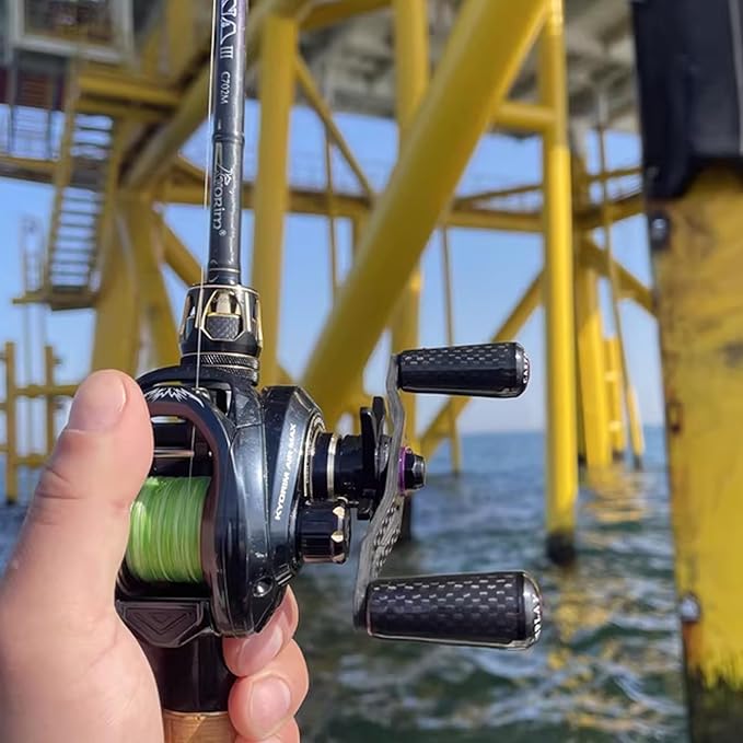 【高強度カーボン製・超軽量設計】 軽くて強度の高いカーボン素材を採用。長時間の使用でも疲れにくく、リールのバランスを崩さずに快適な巻き心地を実現します。