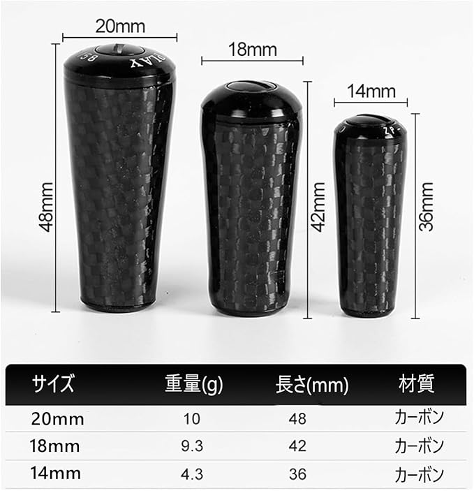 ハンドルノブ TypeA/TypeS 対応 カーボン製 14mm・18mm・20mm 交換ノブ スピニングリール・ベイトリール汎用 軽量 滑り止め カスタムパーツ (ブラック, 14mm)