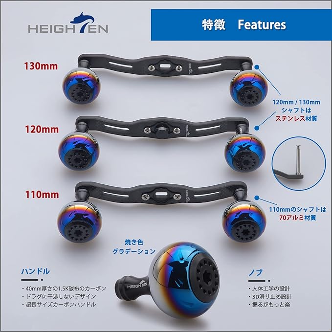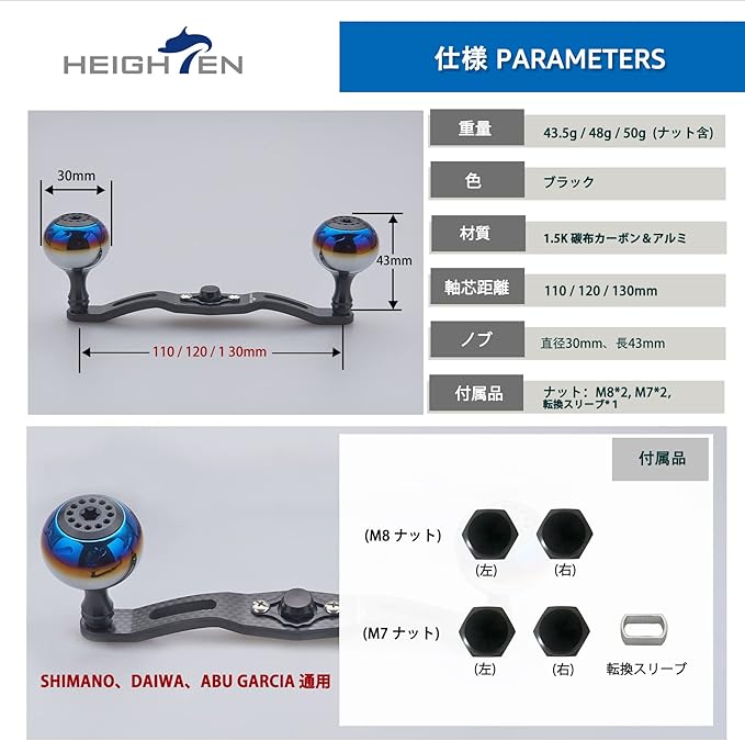 HEIGHTEN 130/120/110mm リール ハンドル 厚さ4mm 1.5K炭布 カーボン 30mmノブ搭載 シマノ(SHIMANO) ダイワ(DAIWA) アブ(Abu) 通用 ベイトリール 用 Aurora Series
