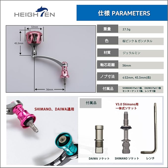 HEIGHTEN 56mm リール ハンドル 32mm ノブ搭載 シマノ ダイワ 通用 スピニングリール 用 Wheel Series