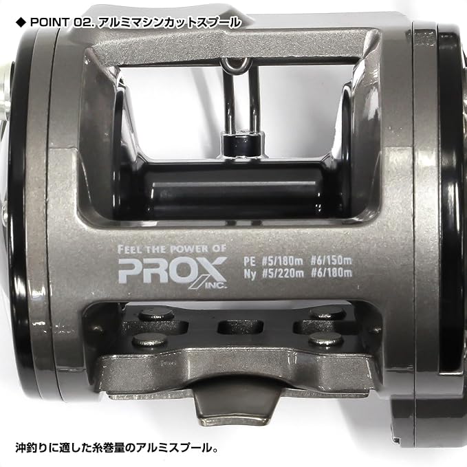沖釣り専用ラウンド両軸リール!アルミマシンカットハンドルとパワーノブを採用し、力強いリーリングを実現します。ステンレス製ボールベアリングを2個内蔵し、滑らかな巻き心地をサポートします。