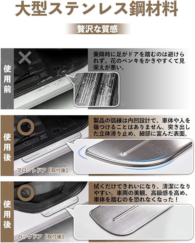 [優れた素材]本製品は高品質ステンレス鋼製で、ステップガードは軽量で耐久性があり、防爆や高温耐性に優れています。サイドシルを守るだけではなく、開閉中に車両を傷、傷、汚れなどから保護することができます。ドレスアップのアクセサリーとして見栄えも良くなります。