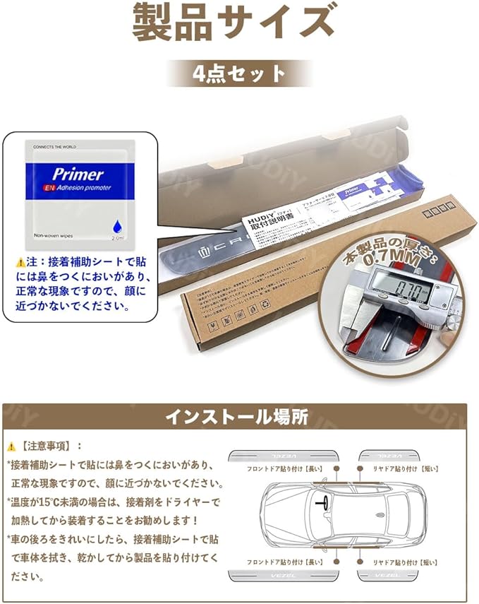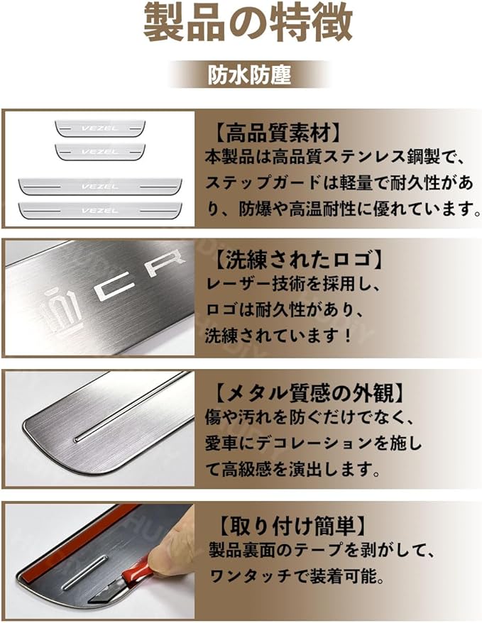 HUDIY(フーディ) ヴェゼル専用 サイドステップガード ステンレス製 スカッフプレート 新型ヴェゼル(2021年4月~現行) ドアスカッフプレート ラゲッジステップカバー 両面テープ付き 滑り止め 汚れ防止 日本語取扱説明書付き 4点セット(シルバー)