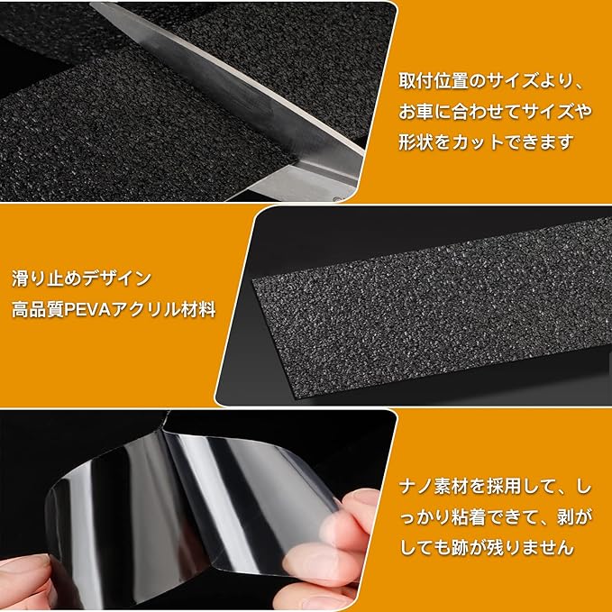 【使用方法】取付け位置を確認後に、お車に合わせてサイズや形状をカットして、背面には両面テープを剥がして固定し、誰でも簡単に取り付き可能です。両面テープはナノ素材を採用して、しっかり粘着できて、剥がしても跡が残りません。多用途:車のバンパー、オーバーフェンダー、フロントスポイラーなど様々に使用可能です。また、自宅で階段マットおよびに滑り止めマットとしても適しています。