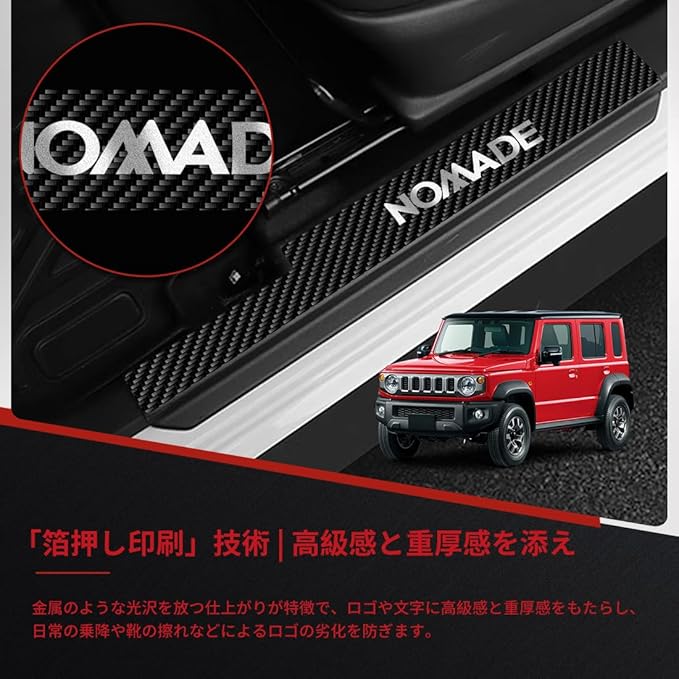 【適合車種】弊社のサイドステップガードは新型ジムニーノマド専用に適合します.弊社の製品は新型ジムニーノマド専用に装着しても違和感なし、ご安心ください.弊社の製品は全て最新の接着技術で研究されて、粘着力は非常に強くてはげることはありません.印字はも褪せる、はげ落ちるなどが決してありません.