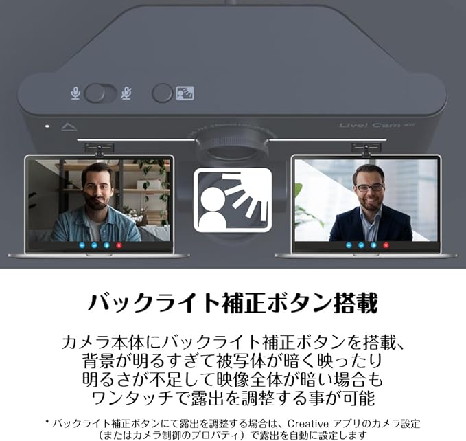 ビデオ通話の際に、背景が明るすぎてあなたの映像が暗く映ったり、明るさが不足して映像全体が暗くなったことはありませんか?こんな場合は、Creative Live! Cam 4Kのバックライト補正ボタンを長押しして、ワンタッチで露出を調整する事ができます。
