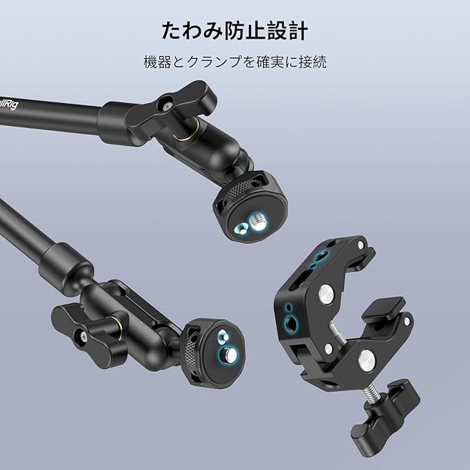 【安定性を高めるたわみ防止設計】マジックアームは、たわみ防止1/4"-20インターフェースを介してスーパークランプにしっかりと接続し、安定性とセキュリティを強化します。誤ってぶつかっても安全です。