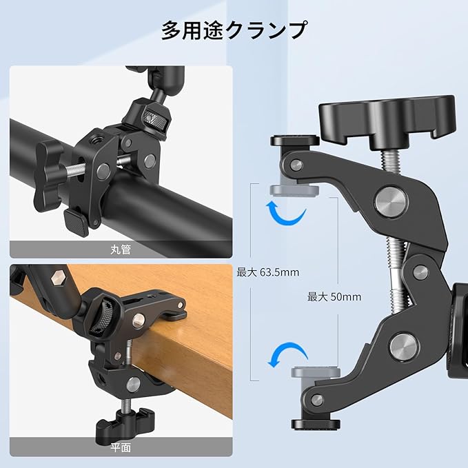 【多用途クランプ】カニクランプは最大63.5mmまで開くことができ、回転可能な摩擦パッドを備え、50mmの開口部があり、通常のデスクトップだけでなく、三脚、スタビライザーハンドルなどの丸いチューブにもクランプするのに適しています。